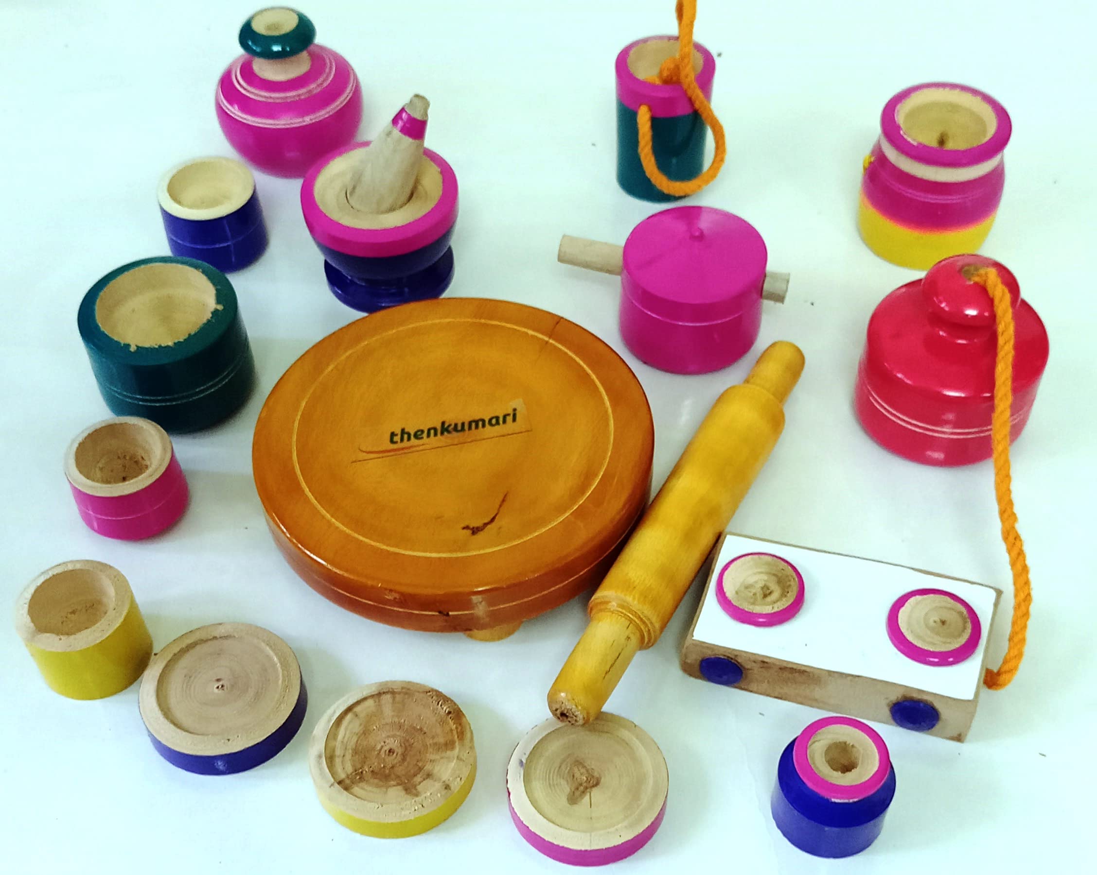 Thenkumari is a Traditional roll play toys for kids.All the wooden utensils are made up of fine wood with polished edges and painted with harmless natural colors. With these wooden toys, the environment of your child will be pleasant and Eco-friendly. By giving these wooden toys you are not only hel...
