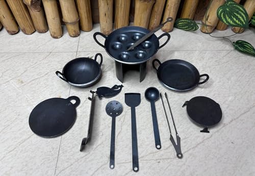 Traditional Iron Miniature Kitchen Set with Chakla Belan – 12-Pieces | Indian Cookware Toy for Kids & Collectors | Includes Stove, Pans, Spatulas, and More